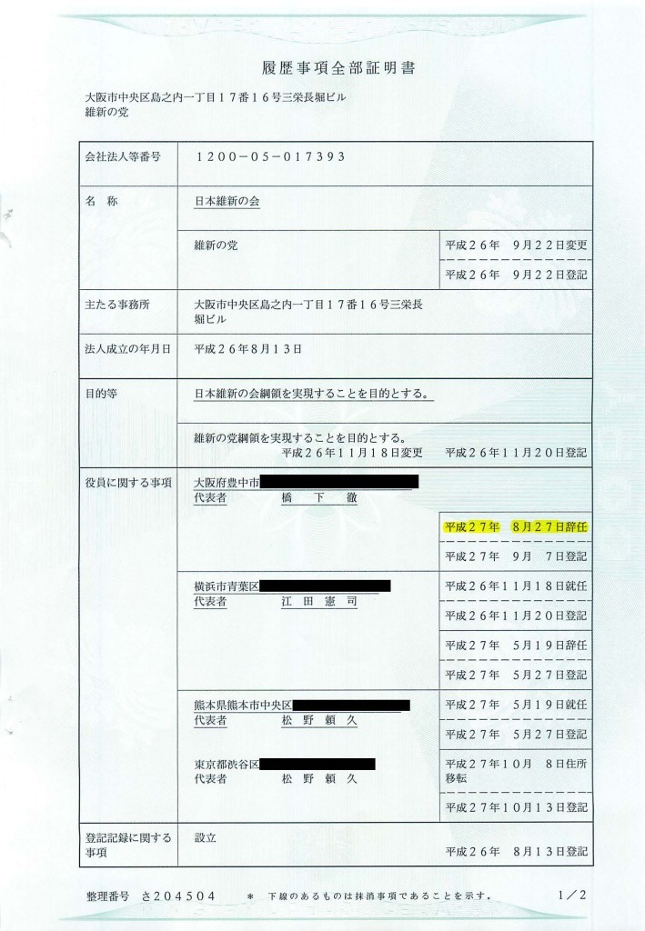 そうではなく、登記が実態を反映しないものであり、この時点で橋下氏は代表権を有していなかったというのなら、今度は平成27年5月27日の松野氏の代表就任登記時において、橋下氏は、自らの代表権を偽って、松野氏が代表権を有するに至った事実を証する虚偽の書面に記名・捺印して登記を申請したことになります。