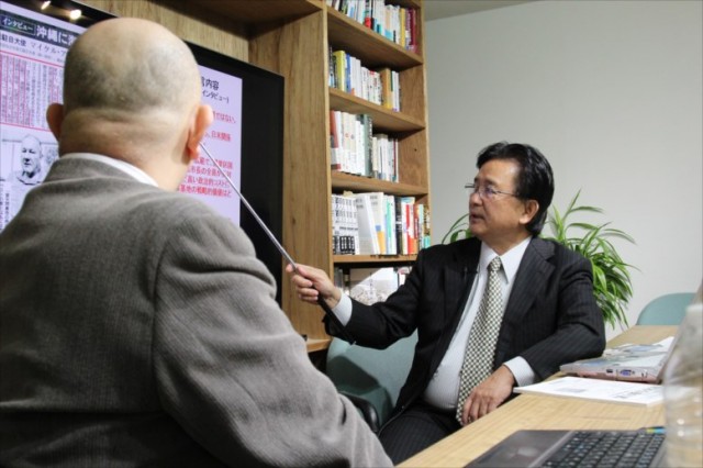 ▲岩上安身のインタビューに答える伊波洋一・元宜野湾市長