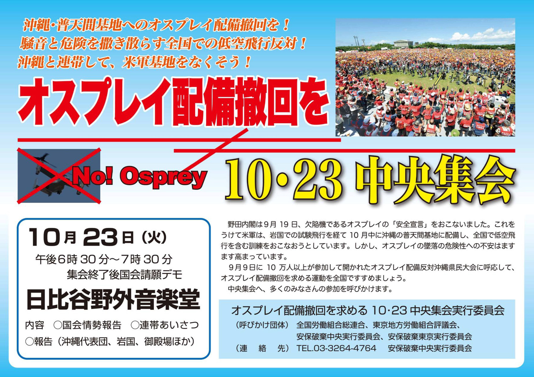 2012年10月23日(火)、東京都千代田区の日比谷野外音楽堂で、「オスプレイ配備撤回を求める中央集会」が行われた。