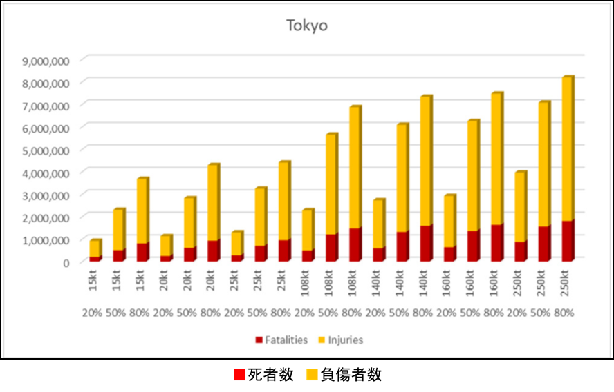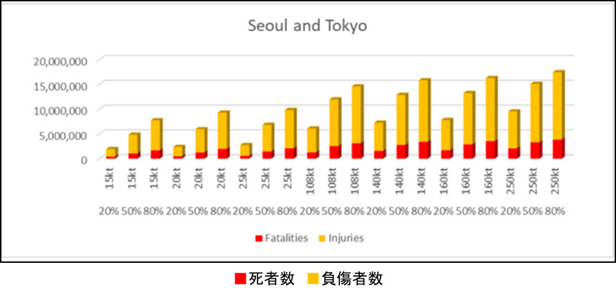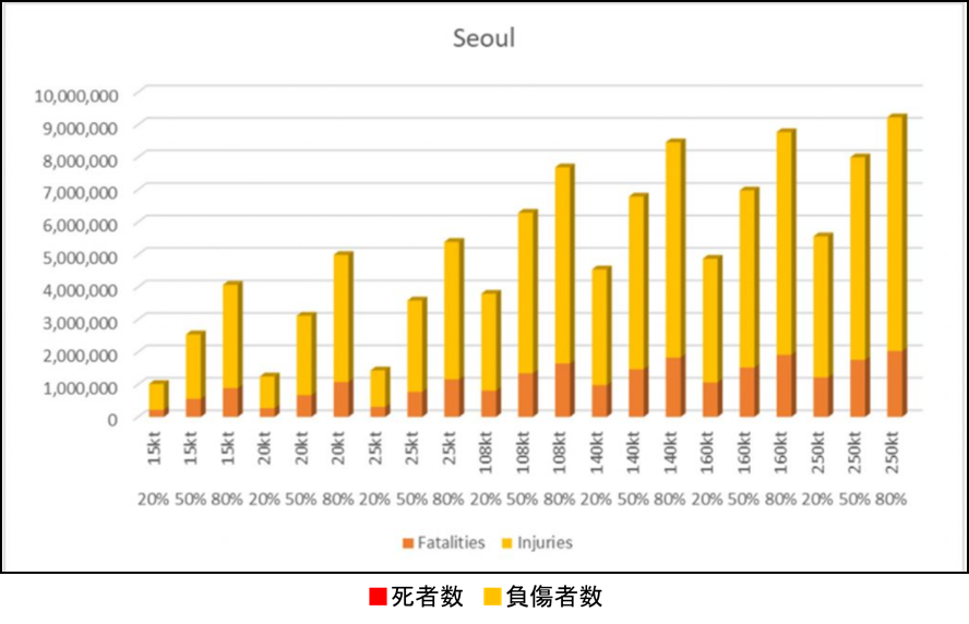 このシミュレーションでは、ソウルと東京への集中的な核攻撃を前提にしており、同時多発的に、複数都市に核攻撃が行われることは前提されていないことや、北朝鮮の核弾頭の保有数が25発とされていることなど、気になる点もあるが、核弾頭の爆発力を7通り、そのそれぞれに爆発確率を3通りと、計21通りのシナリオを設定して、詳細に死者と負傷者を算出している点で、注目すべきである。