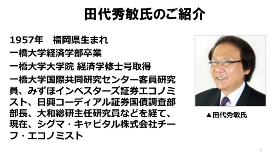 実はこのあと、『信用をなくし、売られる日本経済』というテーマに入りたいのですが、田代さんにはご予定もおありだと思いますし、今日のところを『前編』ということで、また次回お話を伺おうと思います。
