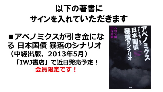 そして、今回関係あるのはこちらですね。『アベノミクスが引き金になる日本国債暴落のシナリオ』(2013年、中経出版)です。この本にサインを入れていただきました。IWJ書店で近々発売予定ですので、ぜひお買い求めください。これは会員限定です。ぜひ会員登録をお願いします。