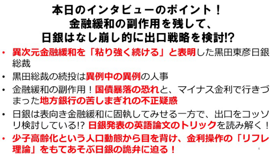 今日のインタビューのポイントですが、なんと、『金融緩和は、副作用がある』というんですね。『日銀は、副作用を残して、なし崩し的に出口戦略を検討している』と」