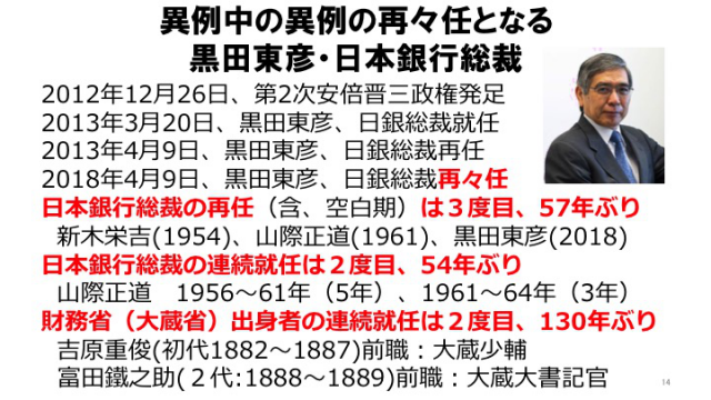 田代氏は、黒田総裁の学者としての優れた資質に敬意を払いつつも、日銀総裁が続投することは「異例中の異例の人事」と懸念している。日銀総裁を再任したのは過去2回、連続就任したのは過去1回しかない。しかも黒田総裁は財務省出身。財務省出身で連続就任を果たしたのは黒田氏ただ1人である。