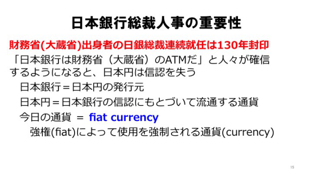 なぜこうした人事が危ぶまれるかといえば、日銀は財務省、大蔵省のATMと思われてはいけないからであり、円の発行元としての信認を得るために政府とは切り離された独立性を持たなければいけないからである。