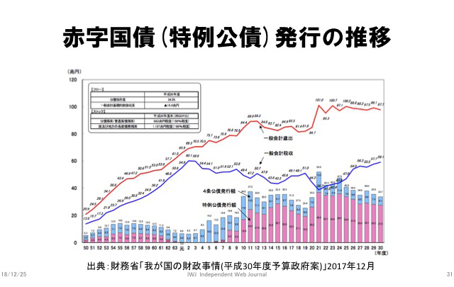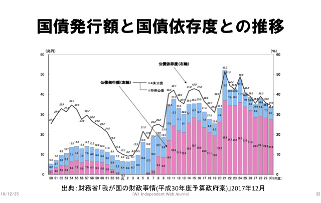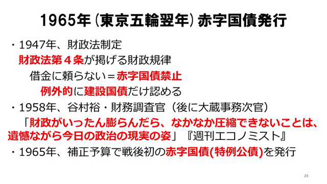 田代「面白いのは、今までのグラフは一番端が1975(昭和50)年で、このグラフに限って端が1965(昭和40)年(1965年)でしょう。財政法の封印を破った年ですよね。そこから日本の国債の累積は始まっているわけです。