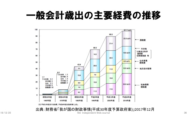 田代「それは、次のグラフを見てください。財政の中身を見てみました。これが一般会計歳出ですね。特別会計はそれぞれ用途別に決まっているから、それを除いて。