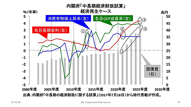 日本政府の唯一の経済的見通し、内閣府提出の「中長期経済財政試算」をグラフ化して見えてくること~2025年には「名目長期金利」が「名目GDPの成長率」を上回る!