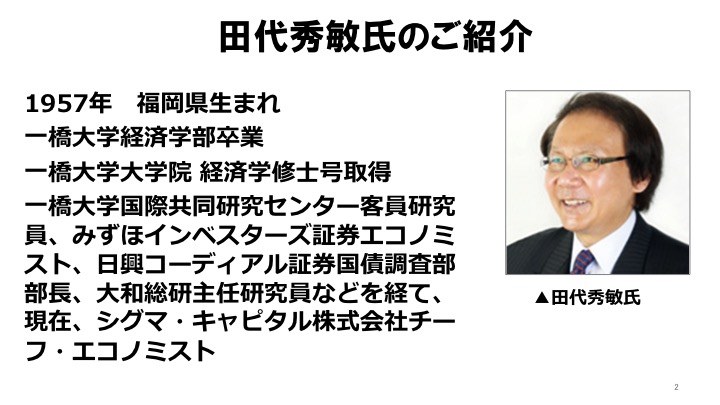あらためてご紹介いたします。田代さんは1957年、福岡県生まれ。私より2歳上の先輩ですね。一橋大学経済学部卒業、一橋大学大学院経済学修士号取得、一橋大学国際共同研究センター客員研究員、みずほインベスターズ証券エコノミスト、日興コーディアル証券国際調査部部長、大和総研主任研究員などを経て、現在、シグマ・キャピタル株式会社チーフ・エコノミスト。赫赫たる経歴をお持ちですけれども、政治の世界にも大変顔が広いし、何でもよく知っていらっしゃるんですよ。中国のことにもものすごくお詳しいんです。中国語はペラペラです」