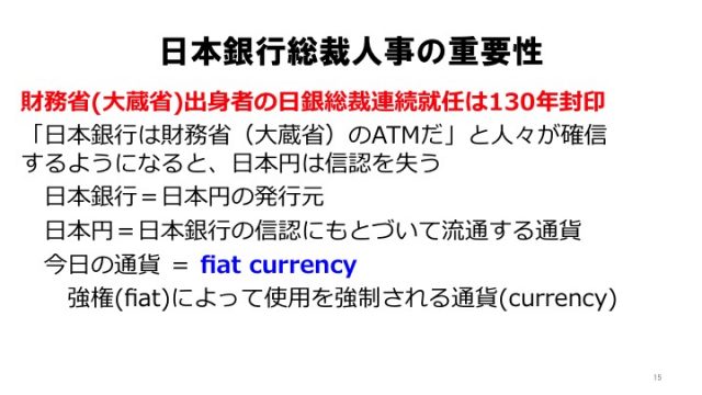財務省、大蔵省に優秀な人はたくさんいますけれども、ここの出身者が連続して日銀のトップになったら、次第に信認が危うくなってきますよね。だから明治時代でも大正時代でも、戦前戦時の昭和時代でも、それは避けたんですよ。