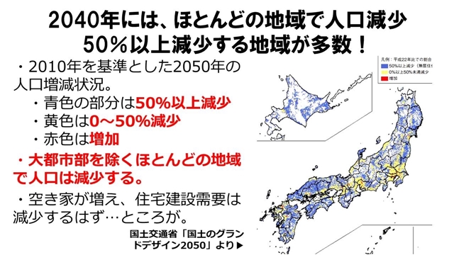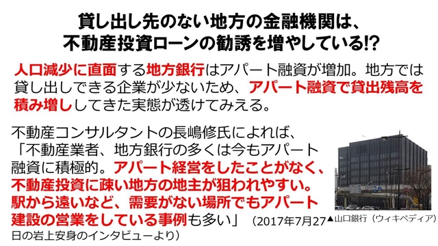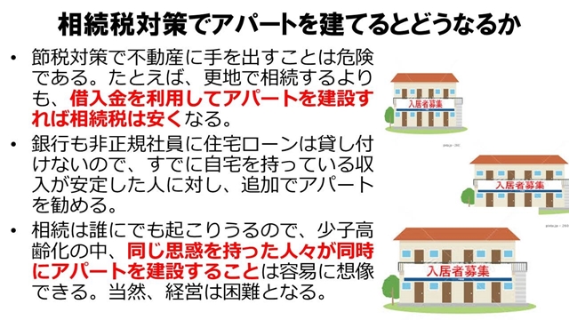 『需要と関係なく、節税のためにアパートが建設される』。業者は新しい家を作り出さないと回っていかないですから、『(人口減で需要減とか)そんなことはもう知ったこっちゃない』ということで、周辺地域の空き家が増えようがどうしようが、賃料水準がるデフレ効果が生じるような新しいアパート建設を、野放図にやってしまっているということですね」