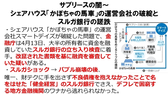 しかしこれがただ単に、『非常に特異なカリスマ社長がめちゃくちゃなブラックを企業作っています』という形で切り取られるのは間違いで、こういうサブリース業(※8)が、非常に荒っぽい手口で『今だけ、金だけ、自分だけ』という感じで儲けようとしている。それは儲けられるだけの地盤がアベノミクスバブルによって生まれて、弾けそうになっているという話。こういう話もこれからうかがいます。