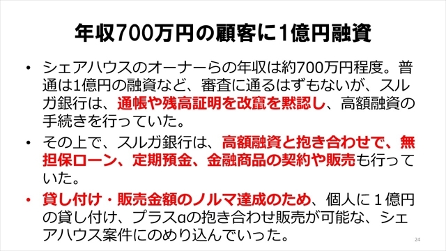 融資していた女性専用シェアハウス「かぼちゃの馬車」を運営するスマートデイズが破綻したことをきっかけに、融資のための数々の不正が内部調査で発覚した。