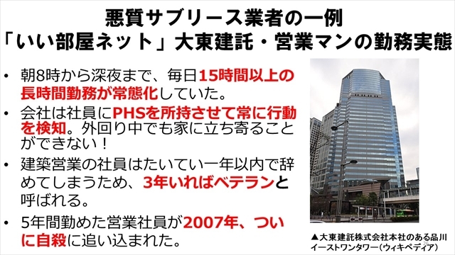そこをよく考えた上で大東建託のことを考えてみたいと思います。内幕本の中に書いてあることのごく一部ですけれども。『8時から深夜まで、毎日15時間以上の長時間勤務が常態化』。『会社は社員にPHSを所持させて常に行動を検知。外回り中でも家に立ち寄ることができない』。『少し寝たいな』などと思っても絶対だめだということです」