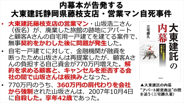 『大東建託静岡県藤枝支店・営業マン自殺事件』。大東建託藤枝支店の営業マン・山坂浩二さん(仮名)が、廃業した旅館の跡地にアパートと顧客Aさんの自宅用一戸建てを建てた案件で、無事契約を交わしたあとに問題が発生。自宅一戸建てに対して、金融機関が融資を断ったため山坂さんは再提案したけれども、顧客Aさんの負担する自己資金が770万円増えたんだそうです。解約を求める顧客と、キャンセルを拒否する会社の間で山坂さんは板挟みになってしまった。そして770万円のうち、360万円の肩代わりを会社から強制された。それで、山坂さんは、2007年10月4日に自殺した。享年42歳。これはいくらなんでもむちゃすぎませんか。