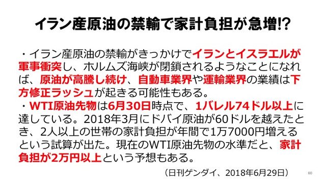『WTI原油先物』(※6)というものがあって、『6月30日時点で、1バレル74ドル以上に達している』ということなんですが、『2018年3月にドバイ原油が60ドルを超えたとき、2人以上の世帯の家計負担が年間で1万7000円増えるという試算が出た』んだそうです。『現在のWTI原油先物の水準だと、家計負担が2万円以上』になるだろうと。これは日刊ゲンダイの記事で言われていること(※7)ですが、これがドンパチ始まったらどこまで行くか、誰も予想つきません。
