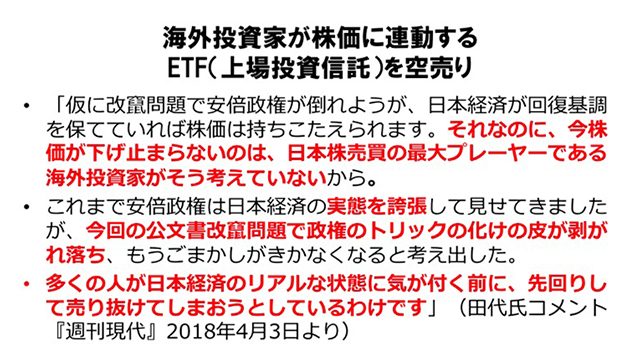 田代「そうです。何十年という長期で買うから、かなりディスカウントして売ってくれるのであって、それは普通の商売も同じでしょう。だから、株価も当然急落するわけです。このたびレートが1月以来の安値だったわけですが、日本株の足を引っ張っているのは、実はトランプ大統領だったという(※2)」