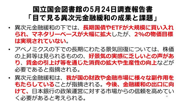 2013年3月20日に第31代日銀総裁に就任した黒田東彦氏は、同28日に初めて参議院財政金融委員会に臨み、経済の動向と日銀の今後の金融政策運営――異例の大規模金融緩和政策――について報告を行った。そのさい、民主党の大塚耕平議員が、財政赤字の対GDP比を表すグラフを示しつつ「日本の財政状況は財政健全化や債務圧縮の必要な局面だという認識が総裁にはあるのか」と質問。黒田総裁は次のように答えつつ、渋々大規模金融緩和の危険性を認めている。