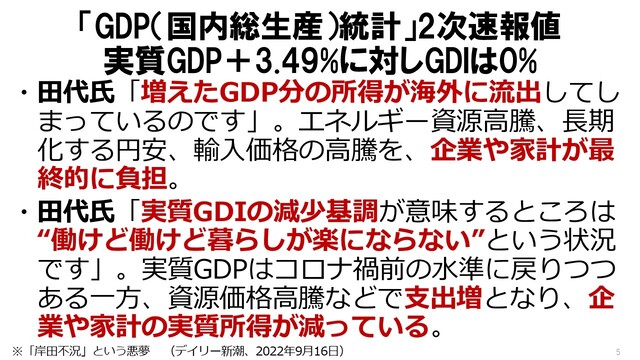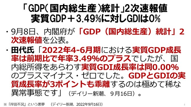 田代氏は、9月8日に発表された国内総生産統計の2次速報(2022年4月~6月)について、国内総生産(GDP)と国内総所得(GDI)の値が開きすぎているのに、大手メディアは政府発表の数値とグラフしか掲載していないと、以下のように指摘した。