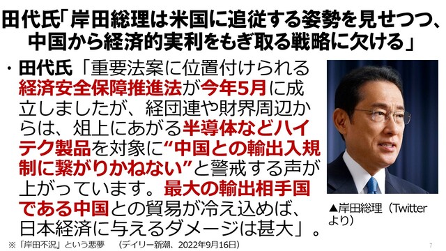 さらに、日本製の半導体などを中国に売らないことを盛り込んだ、経済安全保障推進法についても、「アメリカは喜ぶかもしれないが、日本の基幹産業が潰れてしまう。岸田総理は経済的センスがない」と痛烈に批判した。