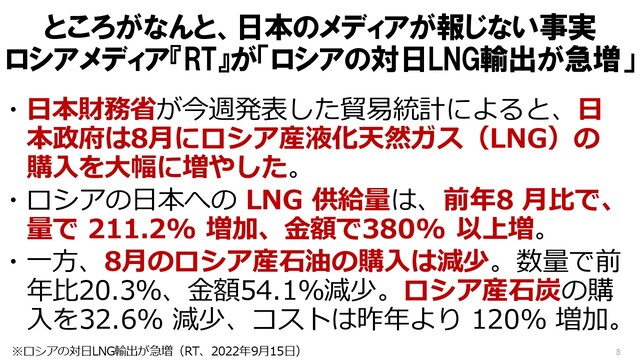 「『日本財務省が今週発表した貿易統計によると、日本政府は8月にロシア産液化天然ガスの購入を大幅に増やした』。ひっそり、増やしてたんですね。『ロシアの日本への LNG 供給量は、前年8月比で、量で 211.2パーセント 増加』。2倍ですよ。『金額で380パーセント 以上増』。
