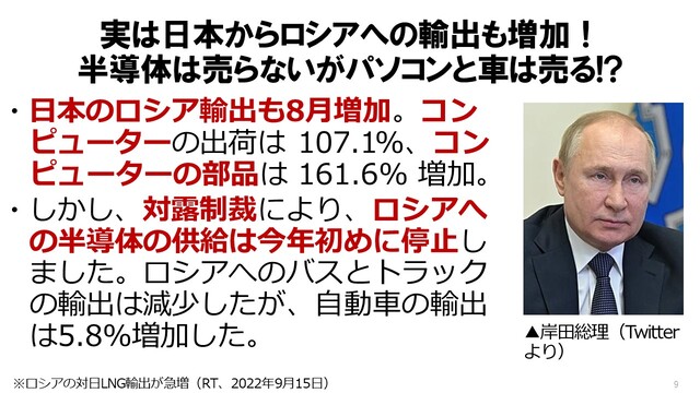 で、対露制裁してるのに、『ロシアへの半導体の供給は今年初めに停止』してた。だけど、半導体停止したけど、コンピューター売ってるという状態ですね。で、『ロシアへのバスとトラックの輸出は減少』。だけれども、『自動車の輸出は5.8パーセント増加した』って、こんな感じなんですけれども」