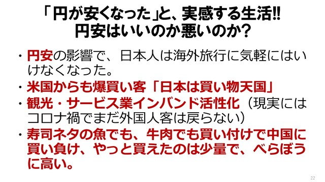 爆買い客といえば中国だったんですけど(※2)、アメリカからも来るようになってると。これ、『日本は買い物天国』だっていうね、何でも日本で買うと安い。で、良い面を見れば、観光とかサービス業、インバウンドが活性化しつつあるけれども、現実にはコロナ禍でね、まだ外国人客は完全に戻ってないんですよね。岸田政権が、入国を緩めるということは発表しましたけれども。ということは、まだ戻りきってないんですよ。だから、そういう意味では受益の部分、円安効果が経済にプラスになるっていうところではない。
