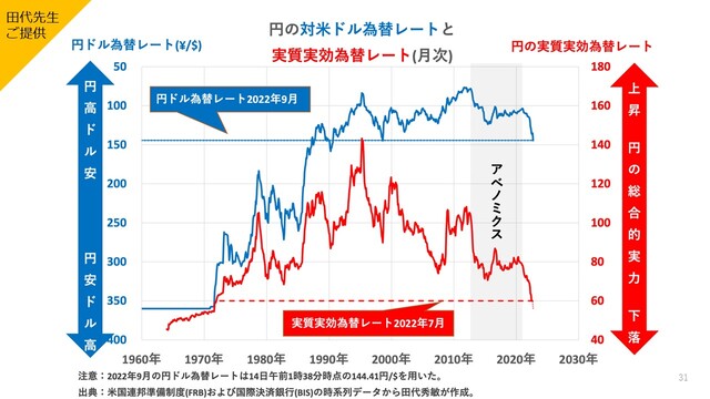田代氏「『実質』っていうのは、物価水準の変動を考慮してますってこと。『実効』、エフェクティブだっていうのは、これは貿易パターンの変化を考慮してますという言葉でね、それで変換するとどうなるかっていうと、この赤の線です。これは指数なんで、これは上に行けば行くほど、円の力は強いと。購買力が高い。下に行けば行くほど」