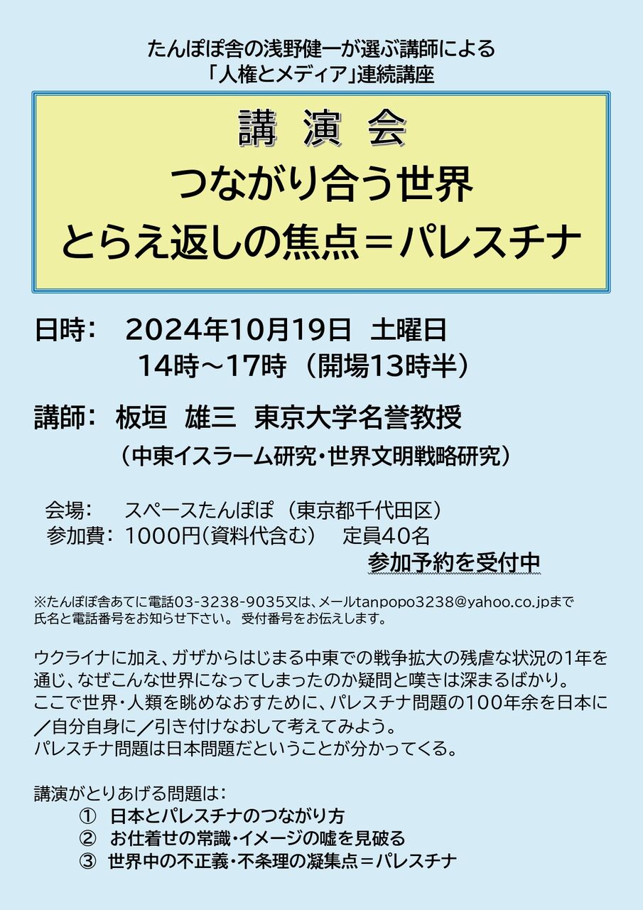 2024年10月19日午後2時より、東京都千代田区のたんぽぽ舎にて、「浅野健一が選ぶ講師による『人権とメディア』連続講座『つながり合う世界』とらえ返しの焦点=パレスチナ」が開催され、東京大学名誉教授(中東イスラーム研究・世界文明戦略研究)の板垣雄三氏が登壇した。