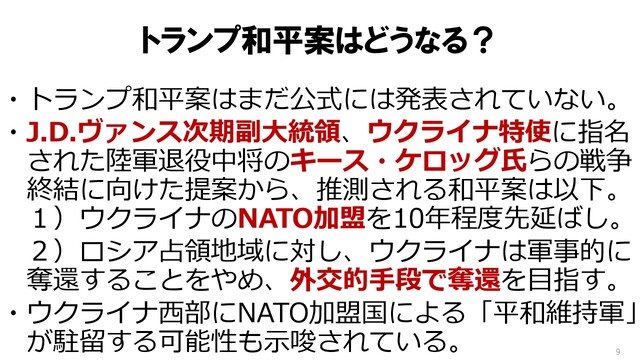 松里教授と岩上安身が、「大統領就任24時間以内の停戦」を謳ったトランプ次期米大統領(このインタビュー時点は大統領就任前)による、ウクライナ和平案を検討したが、ロシアが占領したウクライナ領土の奪還も、ウクライナのNATO加入も、困難と思われた。